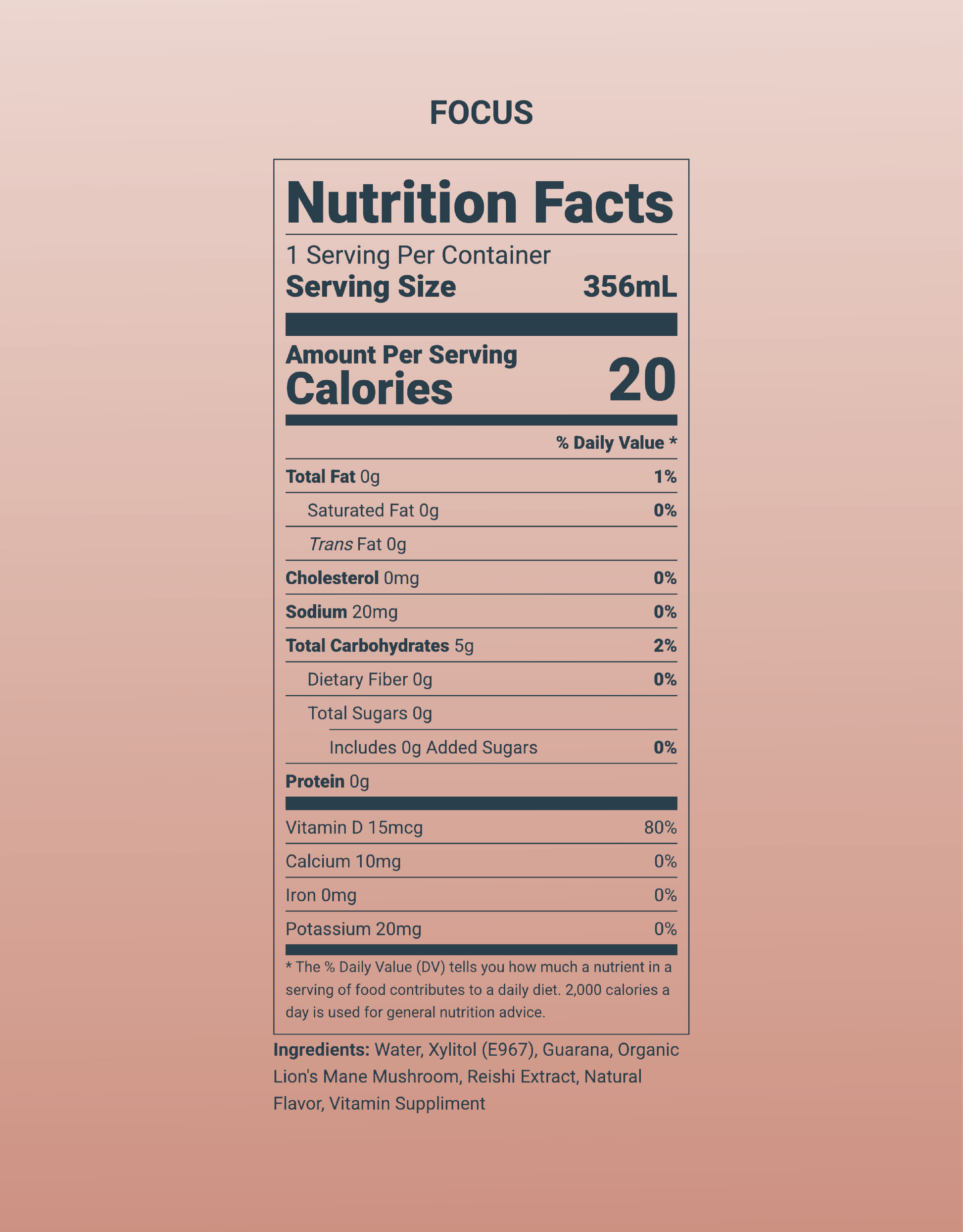 Ingredients: Water, Guarana (100mg Caffeine), Organic Lion's Mane Mushroom, Reishi Mushroom, cordyceps Mushroom, Natural Flavor, Electrolytes, Xylitol.