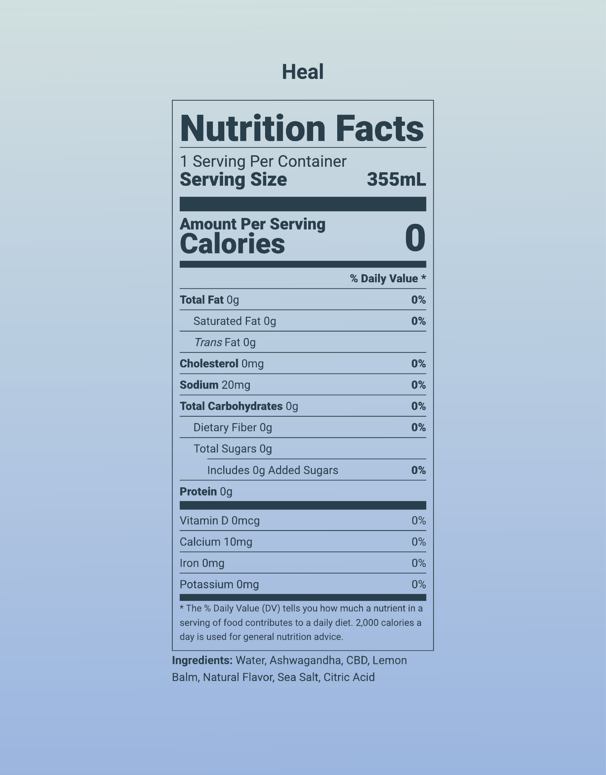 Ingredients: Water, Ashwagandha, CBD, Lemon Balm, Natural Flavor, Sea Salt, Citric Acid